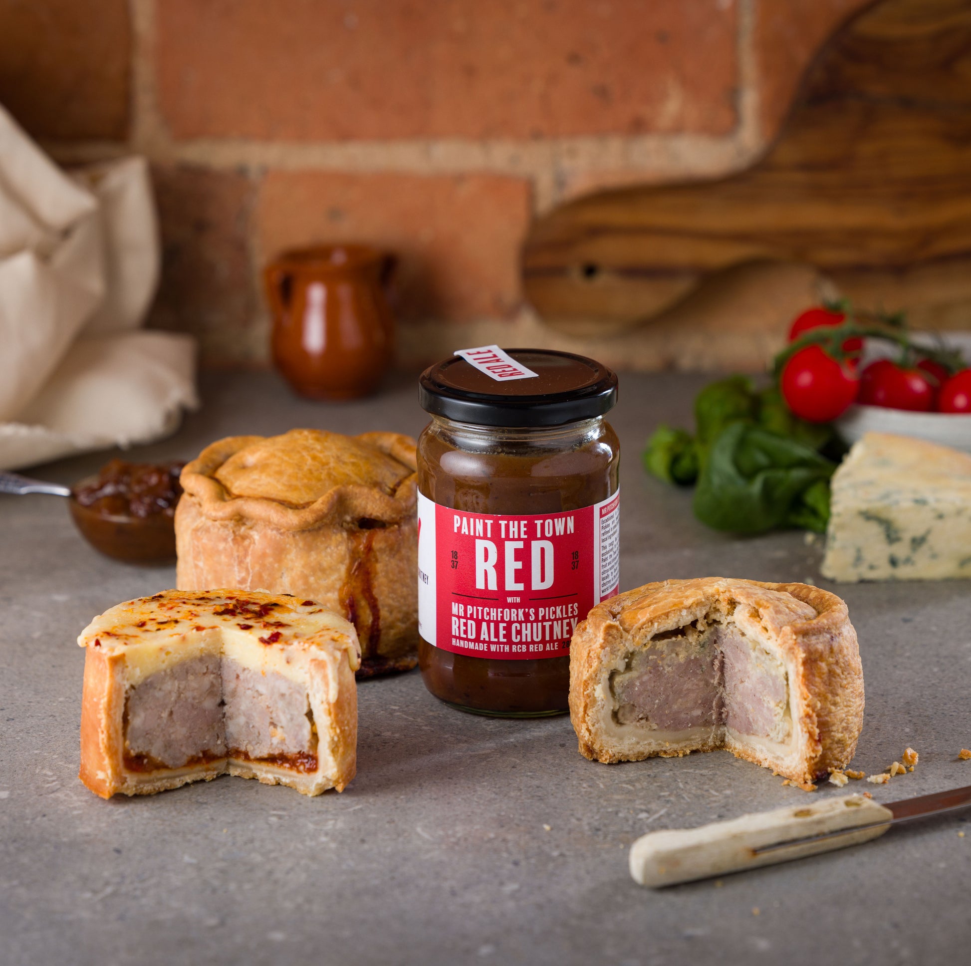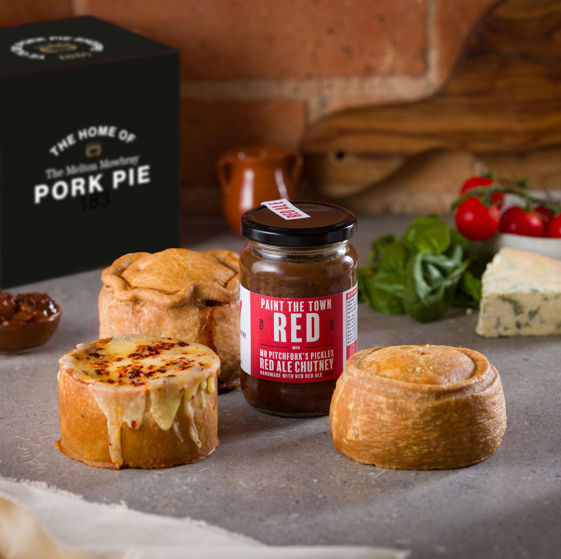 Dickinson & Morris hand finished pork pie (440g) Mrs King's Stilton pork pie (320g) Cheddar & chilli jam topped pork pie Paint the Town Red, red ale chutney 1912 Artisan Stilton